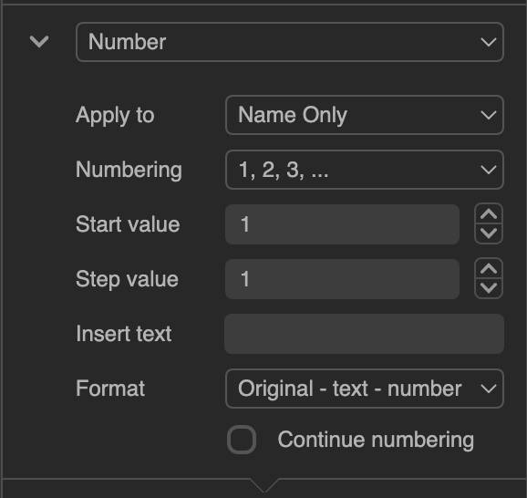 | Step value | The jump in numbering for every file. E.g. if the value is 2, then the numbering will go 1, 3, 5, etc. |